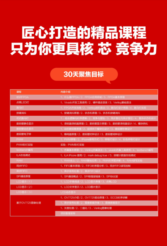 我们精心准备了一系列课程,内容覆盖FPGA设计、数字信号处理、硬件描述语言,以及人工智能在FPGA上的实现等领域。每个环节都紧密贴合行业趋势,确保你所学即所用,一路领跑技术前沿。