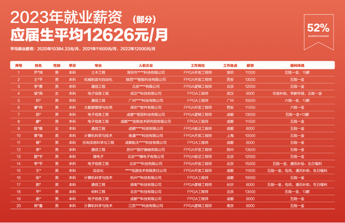 2020年就业入职学员平均薪资10384.33元;2021年就业入职学员平均薪资11600元;2022年就业入职学员平均薪资12000元;2023年就业入职学员平均就业薪资12626元,入职企业在军工企业、国企、央企等。