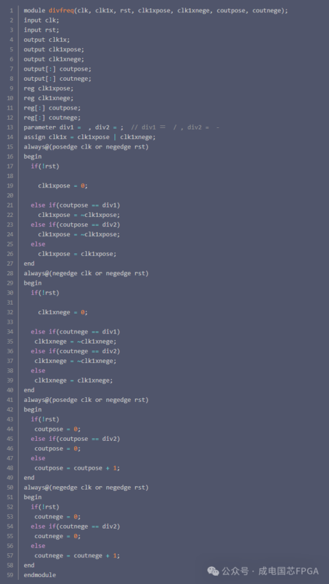 答:5分频,奇数分频都可以类似这么做,只需要改div1和div2的参数。div1为奇数分频除2的余数。采用上升延和下降延分别触发不同波形,最后叠加的方式产生奇数分频。