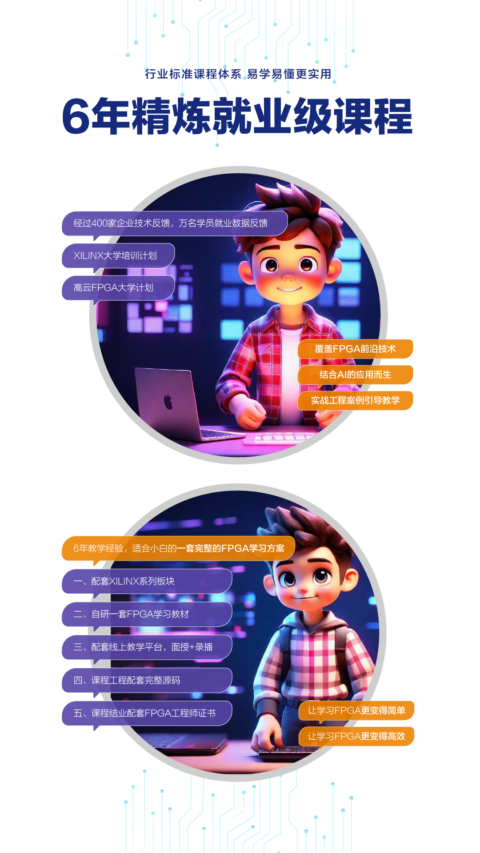 - 全面且前沿的课程内容:课程不仅涵盖 FPGA 技术的基础知识,还深入讲解其在人工智能、高速通信等热门领域的高级应用。从硬件描述语言到开发工具与平台,再到算法级优化,以及大量的项目案例与实战演练,让学员全面掌握从设计到实现的全过程,培养学员成为具备扎实专业技能和丰富实践经验的 FPGA 工程师 10。