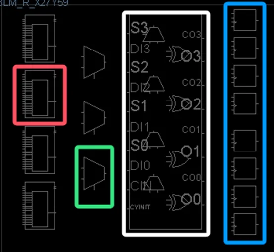 这里面有四种逻辑bel,蓝色框的是FF(触发器),红色框的是LUT(查找表),绿色框是复用器,白色框可以理解为简单的DSP资源。