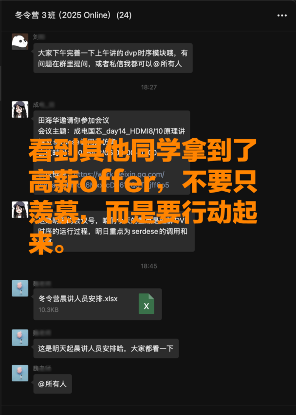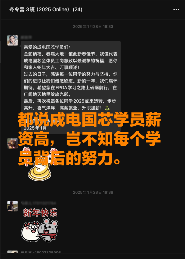每一个成功都不是偶然,每一份高薪offer的背后,都是无数个日夜的努力和付出。看到成电国芯的学员们收获高薪,我们不能仅仅停留在羡慕的层面,更应该行动起来。如果你也渴望在FPGA领域有所建树,那就像他们一样,拿出坚定的决心和不懈的努力,付出比别人更多的时间和精力去学习。
