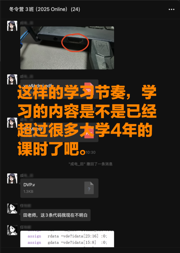 在这样高强度、快节奏的学习进程中,他们所学习的内容,早已远远超过了很多大学四年的课时量。从数字电路基础到硬件描述语言,从FPGA架构原理到复杂的项目实践,他们一步步深入探索,不断突破自己的极限。大量的知识、复杂的概念,在他们的刻苦钻研下,逐渐变得清晰明了。