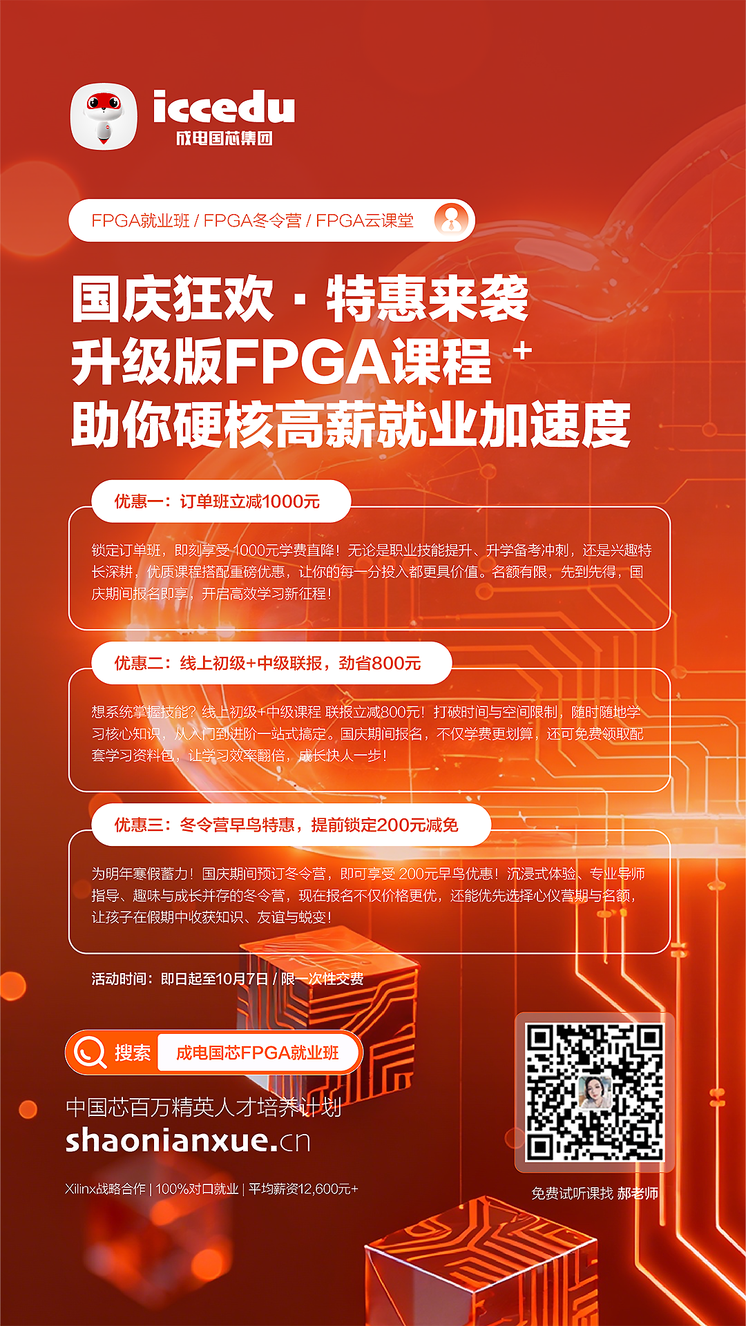 从基础接口的精准掌控,到进阶技术的壁垒突破;从跨域技术的融合创新,到职业价值的全面释放,「FPGA工程师破界之路」不仅是一条技术成长路径,更是一场关于热爱、突破与价值创造的修行。