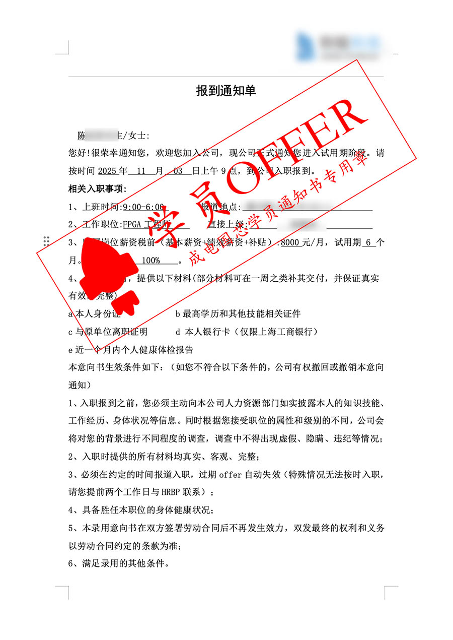 在秋招季的焦虑浪潮中,成电国芯学员桂同学的故事像一束光穿透迷雾——这位计算机专业应届本科生,手持FPGA开发工程师录用通知,试用期薪资8K的消息在校园里引发热议。这个数字背后,不仅是一份工作的起点,更是当代青年在芯片产业浪潮中把握机遇的生动注脚。