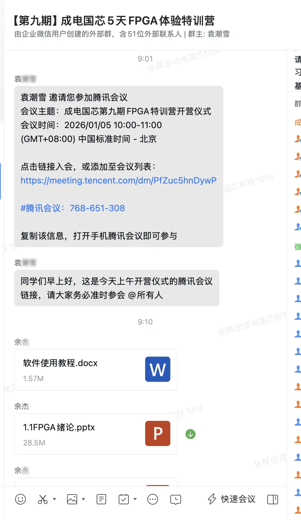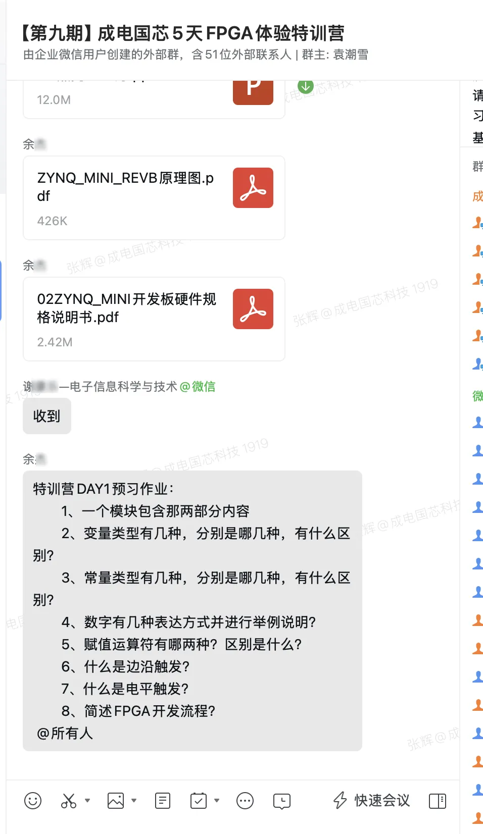 参与本次特训营的 51 位学员涵盖行业不同领域,交流群内已形成积极的预习互动氛围。成电国芯团队将在特训营期间提供实时答疑、资料补充、实操指导等支持,确保学员将理论知识落地到实际操作中,快速建立完整的 FPGA 开发入门认知。