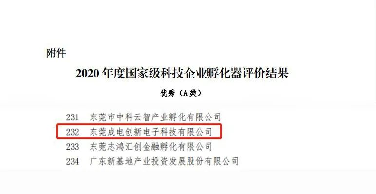 12月10日,科学技术部火炬中心公布了国家级科技企业孵化器2020年度评价结果,筛选出一批发展潜力较大、专业化程度较高的优质科技企业孵化器。电子科技大学广东电子信息工程研究院(简称“电研院”)全资子公司——东莞成电创新电子科技有限公司(简称“成电创新”)再次榜上有名,获评优秀(A类)国家级科技企业孵化器!