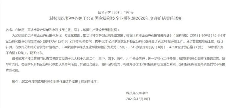 原文链接:《科技部火炬中心关于公布国家级科技企业孵化器2020年度评价结果的通知》