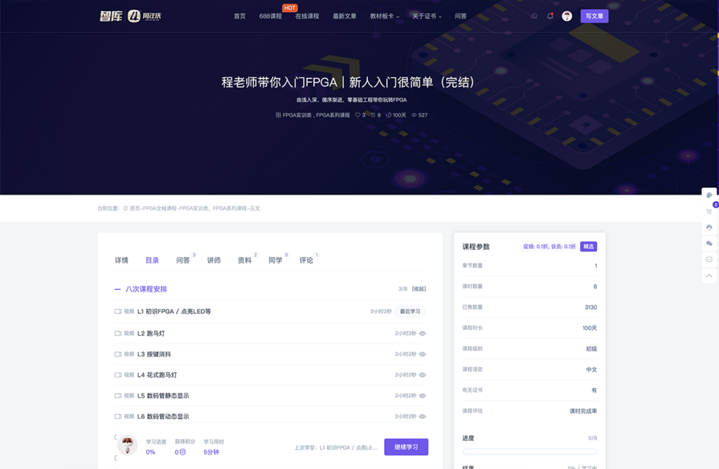 目前,同学们可以进行免费申请,在线学习FPGA课程了。课程有《程老师带你入门FPGA|新人入门很简单(完结)》、《黄老师带你玩转FPGA之“广告点阵屏工程”(完结)》、《黄老师带你玩转FPGA之“智能循迹小车工程”(两周版)》等,其他课程正在逐步更新中,同学们可以随时关注https://z.guoxinedu.cn。