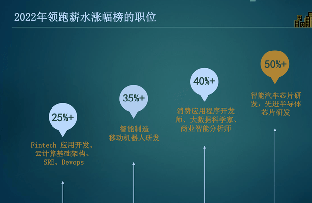根据调研,宋倩表示,具体到岗位,2022年领跑薪水涨幅榜的职位排名第一的是智能汽车芯片和先进半导体芯片研发,涨幅超50% ;消费应用程序开发师、大数据科学家、商业智能分析师涨幅超40% ;智能制造移动机器人研发涨幅超35% ,云计算基础架构等职位涨幅超25% 。