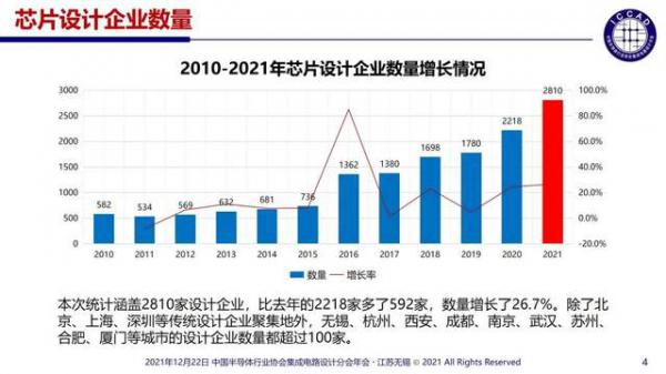 根据半导体行业协会的数也据显示,2021年(截至12月1日),国内芯片设计企业已经由2020年的2218家增长了592家,达到了2810家,同比增长26.7%。其中,除了北京上海、深圳等传统设计企业聚集地外,无锡、杭州、西安、成都、南京、武汉、苏州合肥、厦门等城市的设计企业数量都超过了100家。